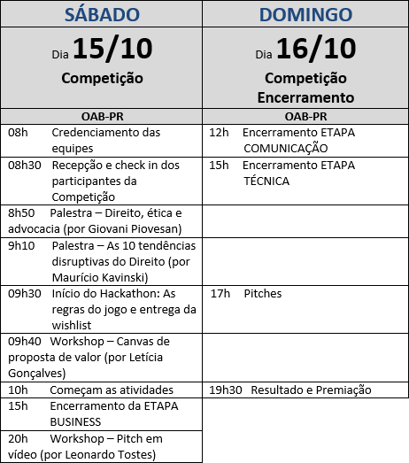A competição ocorrerá na sede da OAB-PR, no endereço Rua Brasilino Moura, nº 253, em um ambiente preparado para as necessidades de dois dias intensivos, incluindo a madrugada, com alimentação incluída. Serão declarados vencedores os três produtos mínimos viáveis mais bem construídos e pontuados de acordo com os mentores e juízes.