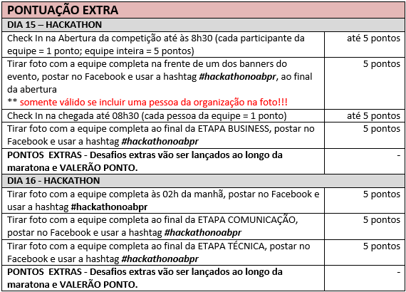 As equipes serão pontuadas segundo alguns critérios ao longo da competição. Veja a tabela com as ETAPAS OBRIGATÓRIAS e a PONTUAÇÃO EXTRA